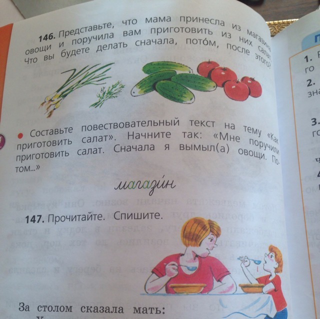 Мне поручили приготовить салат.Сначала я вымыла овощи,затем нарезала огурцы и помидоры,лук и укроп.Я достала оливковое масло и заправила свой салат.Маме,мне и папе он очень понравился.Мама попросила меня готовить этот салат каждые выходные.