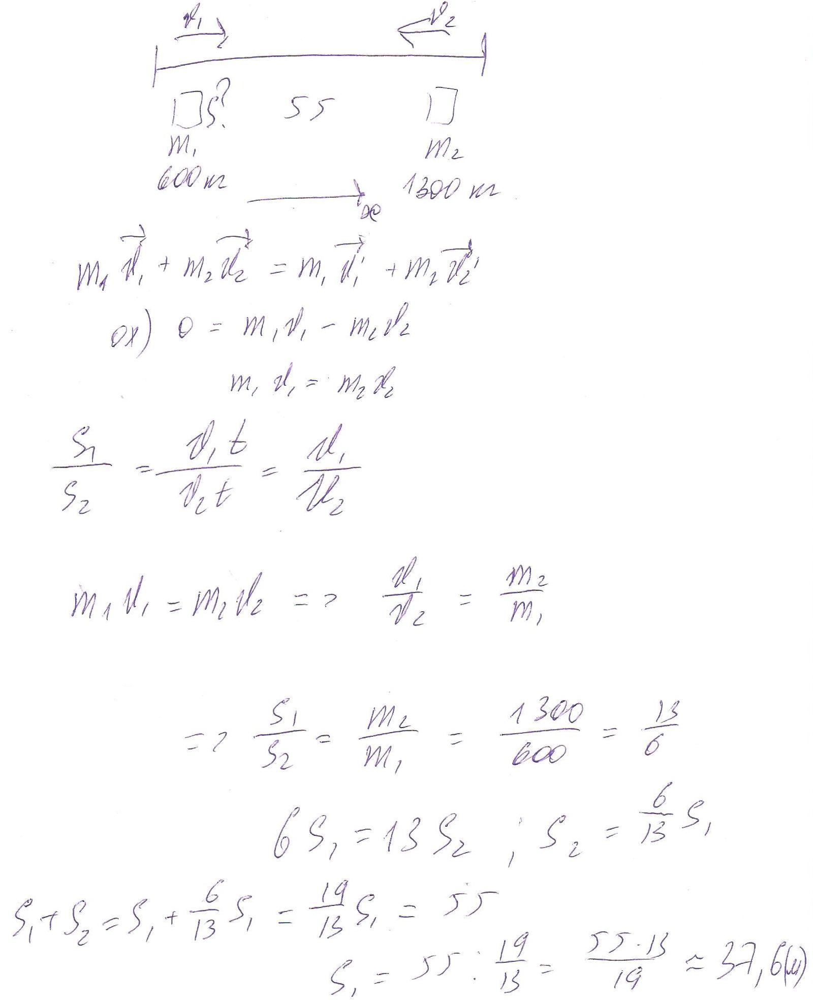 Масса лодки равна 600 кг, а масса катера 1300 кг. С катера скинули канат. И начали тянуть равномерно из состояния покоя. Какой путь прошла лодка до встречи с катером, если расстояние между ними 55 метров. Сопротивление воды пренебречь.