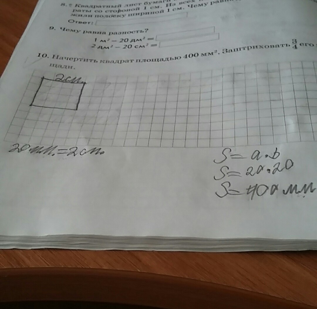 Мне срочно нужно фото квадрата площадью 400 мм2 инадо разделить квадрат на 4 стороны.