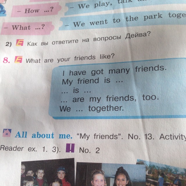 У меня много друзей. Моего друга зовут Алекс. Он очень дружелюбный и добрый. Он мой лучший друг. Соня, Саша и Паша - мои друзья тоже. Мы всегда играем, болтаем и смотрим разные фильмы по ТВ вместе. Я люблю их очень сильно.