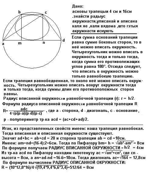 асновы трапецыи 4 см и 16см .знайсти радыус акружнасти,уписанай и аписана каля яе ,кали вядома ,што гэтыя акружнасти иснують