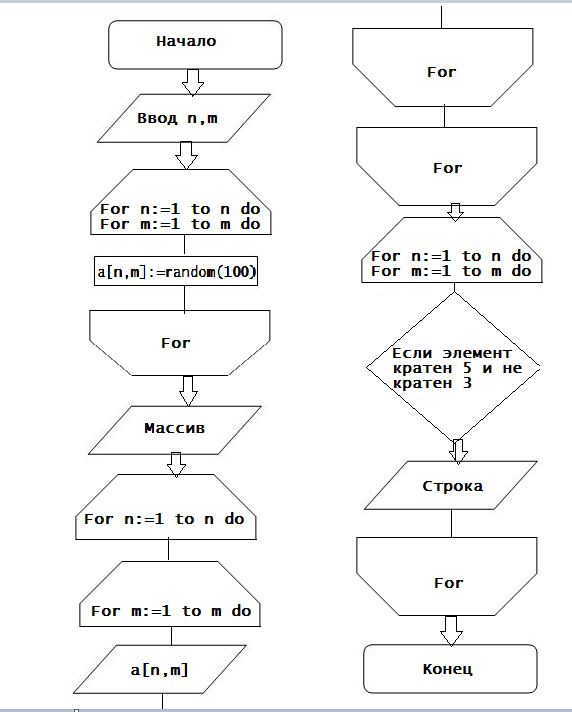Помогите. пожалуйста, сделась блок-схему и написать программу.... Дана матрица A(n*m). Найти номер строк, где все элементы кратны 5 и не кратны 3.