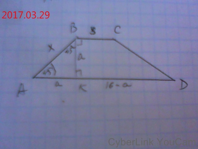 S=0,5(ВС+АD)·ВК=0,5(3+16)·а=0,5·19·а=9,5а. Напоминаю , что величину а найдешь, если АВ=х дано в задаче.