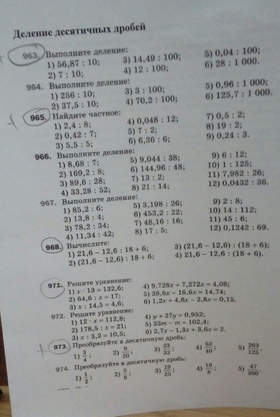 964)2) 37.5:10=3.75 3)3:100=0.03 4)70.2:100=0.702. 966) 2)169.2:8=21.15 4)89.6:28=0.64 3)89.6:28=3.2. 968) 2)(21.6-12.6):18+6=6.5. 3)(21.6-12.6):(18+6)=0.375. 4)21.6-12.6:(18+6)=21.075. 973) 4)5340=1 целая 1340 5)263125=2 целые 13125