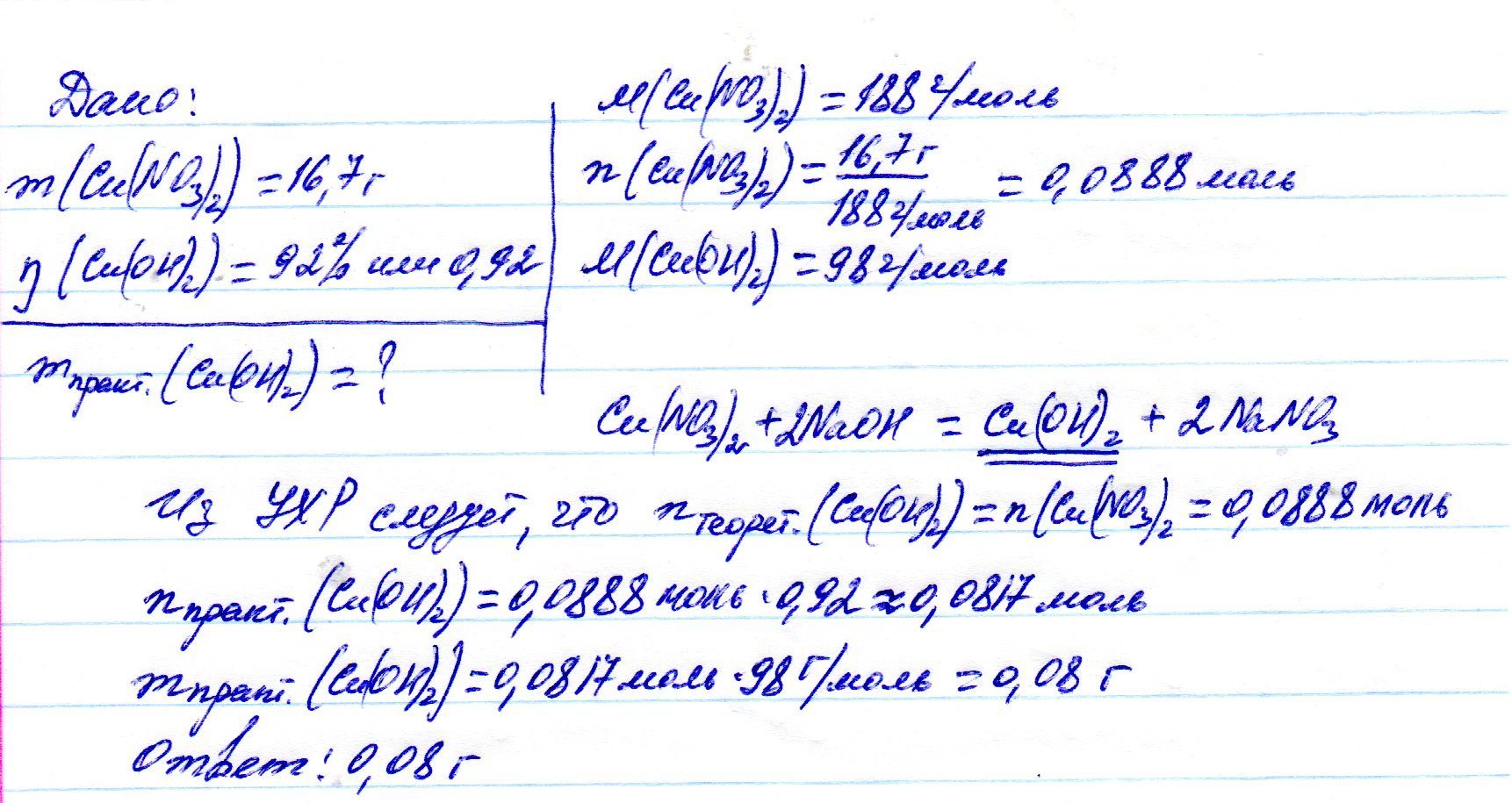 на всзаимодействи 16.7 грамм купрума нитрата с naoh образовался купрум (2) гидроксид с выходом 92 процента