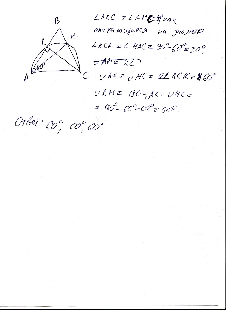 На диаметре окружности построен равносторонний треугольник. Опредилите градусную меру дуг, на которые стороны треугольника делят полуокружность.