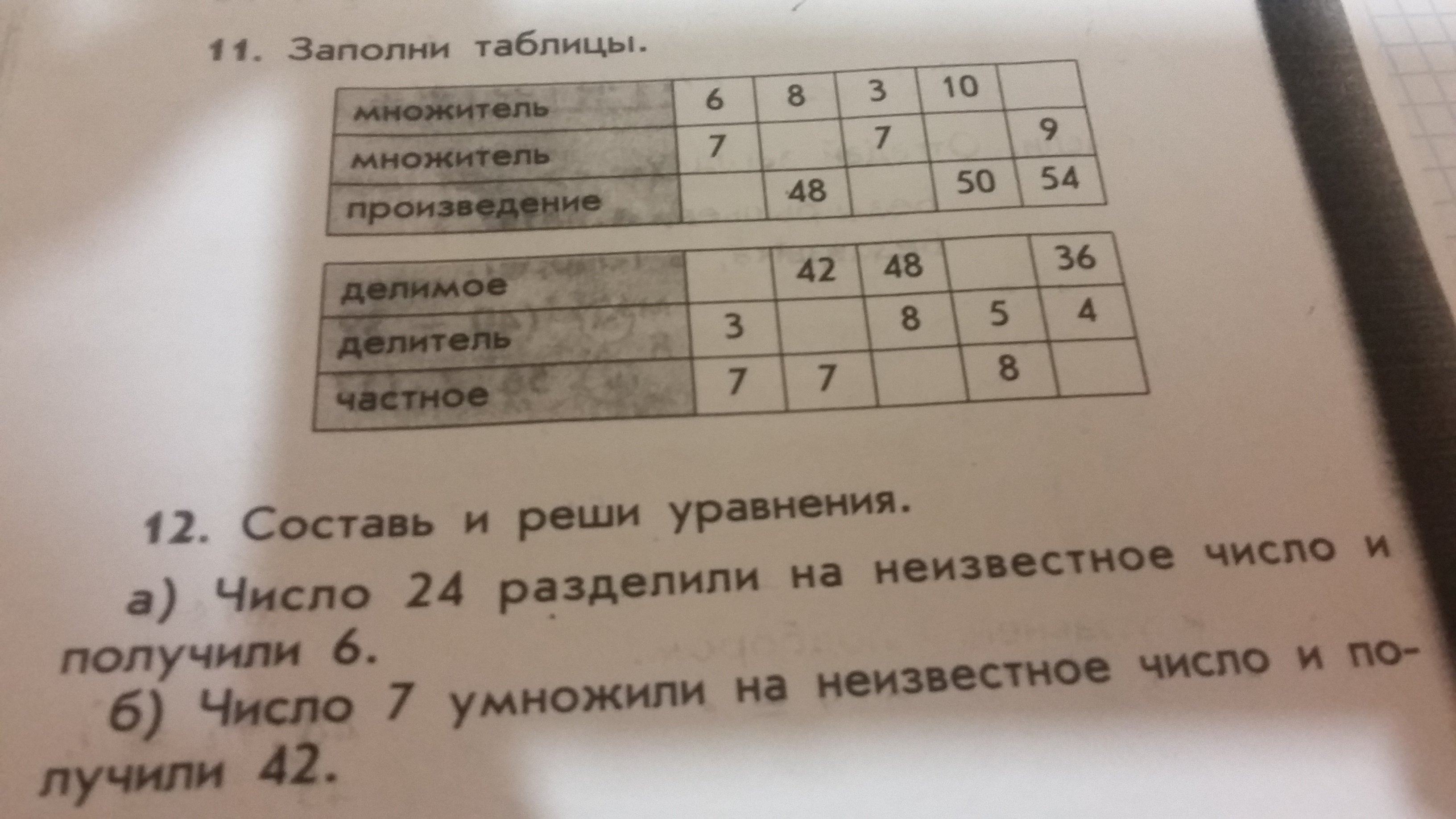 В первой таблице: 6 умножить на 7 = 42 внизу, следующая 8 умножить в пустую клетку пишем 6 = 48, следующая 3 умножить 7 =21 в низу пишем и последний столбик в пустой клетке 6.В следушей таблице в пустых клетках : 27, потом 6, потом опять 6, и последняя 9.