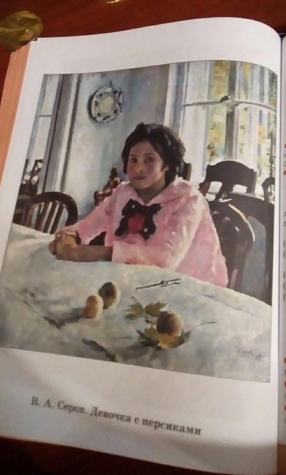 В. А. Серов Девочка с персикамиВ просторной, залитой солнечным светом комнате за большим обеденным столом сидит девочка, в руках она держит золотистый персик. Непокорные темные волосы растрепаны, взгляд ее карих глаз спокоен, но в них затаился лукавый огонек. Перед нами картина талантливого живописца В.А.Серова «Девочка с персиками». Это портрет двенадцатилетней Веруши Мамонтовой, дочери московского купца и мецената. Увидев живую и непоседливую девочку в тот миг, когда она прибежала из сада с персиком в руке, художник предложил ей позировать. Хотя на первый взгляд, кажется, что картина создавалась в порыве вдохновения, работа заняла больше трех месяцев. Именно это произведение и принесло Серову славу.