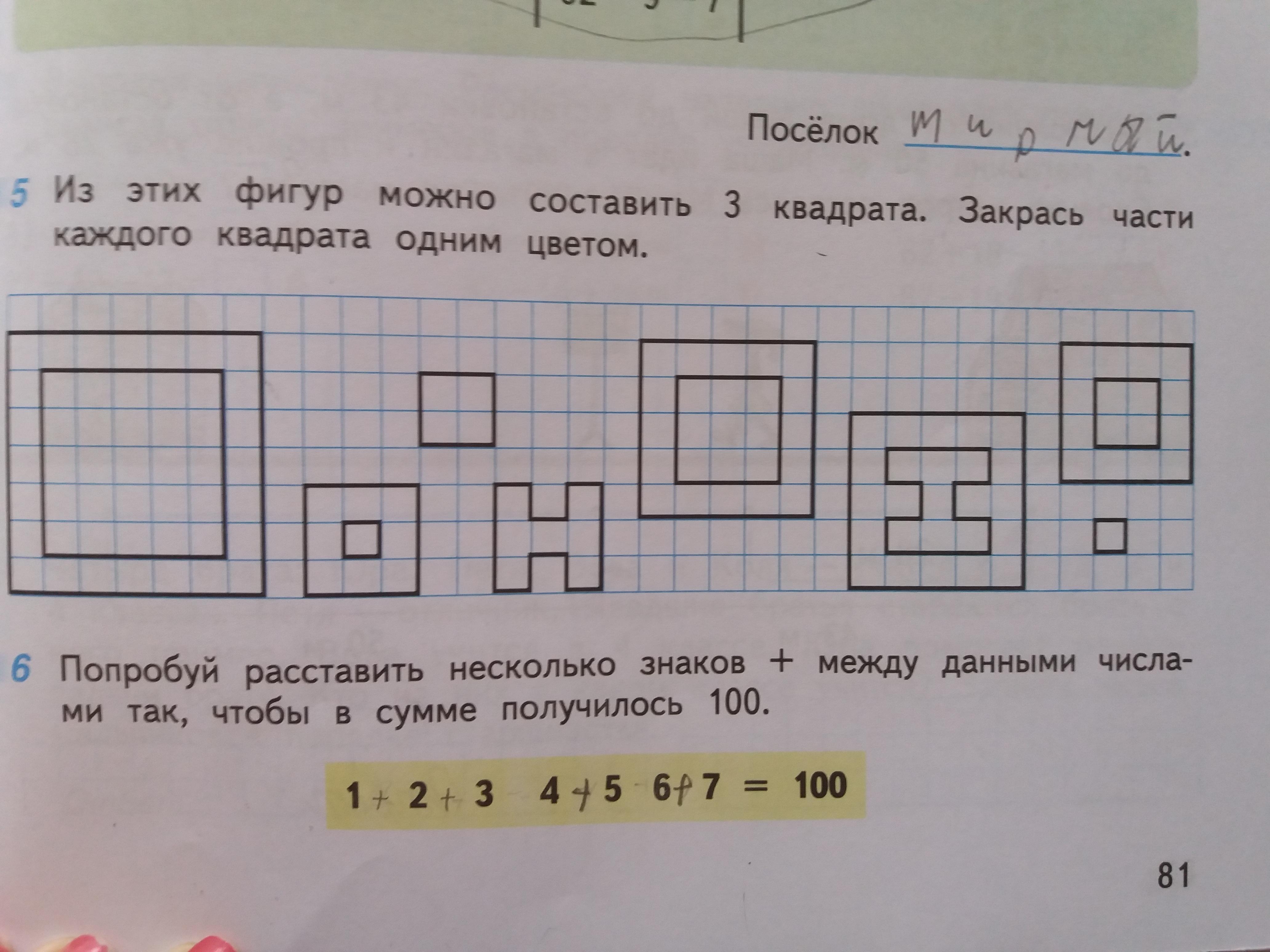Из этих фигур можно составить 3 квадрата. Закрась части каждого квадрата одним цветом.