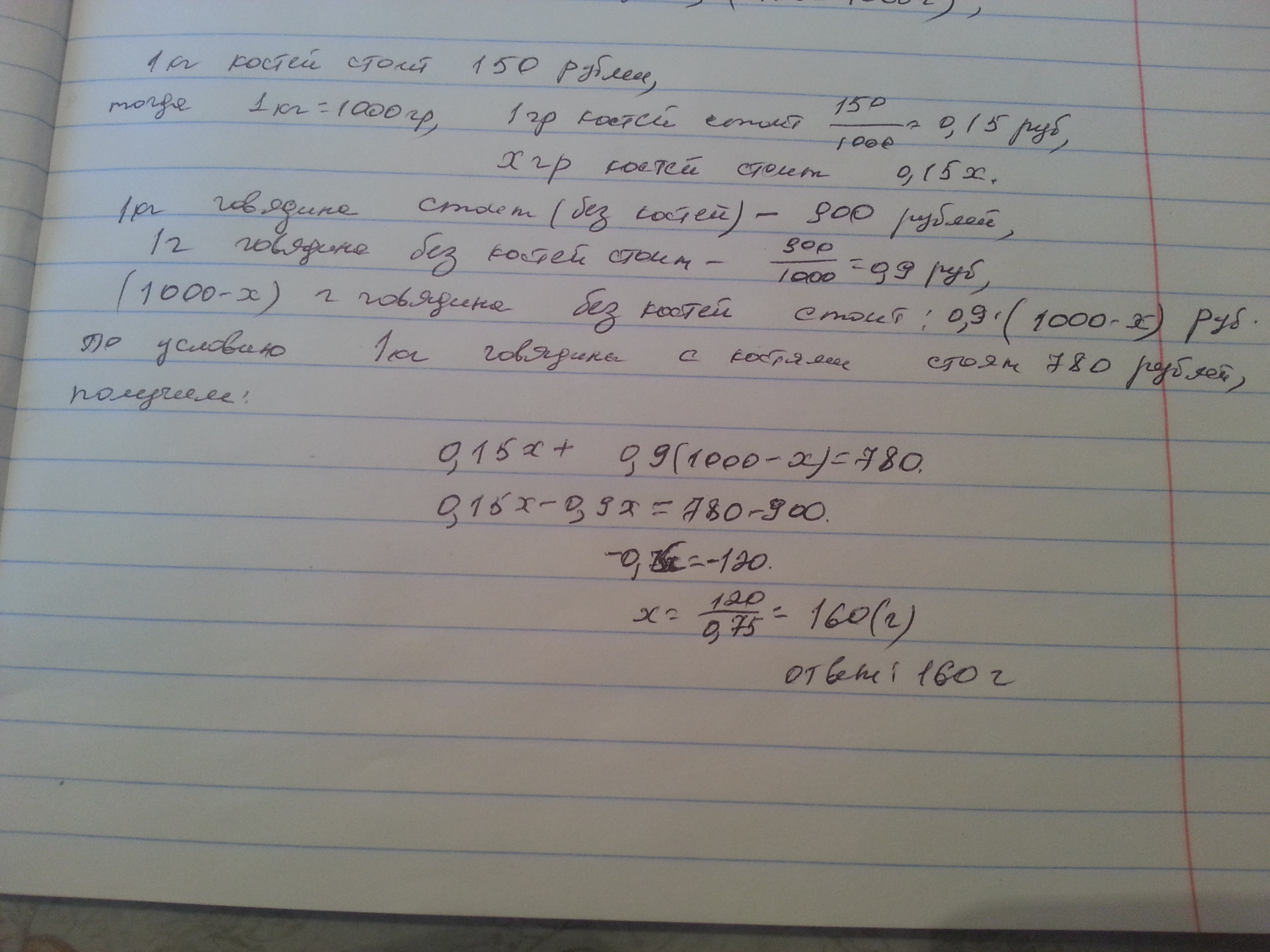 килограмм говядины с костями стоит 780 рублей, килограмм говядины без костей - 900 рублей, а килограмм костей - 150 рублей. сколько граммов костей в килограмме говядины?