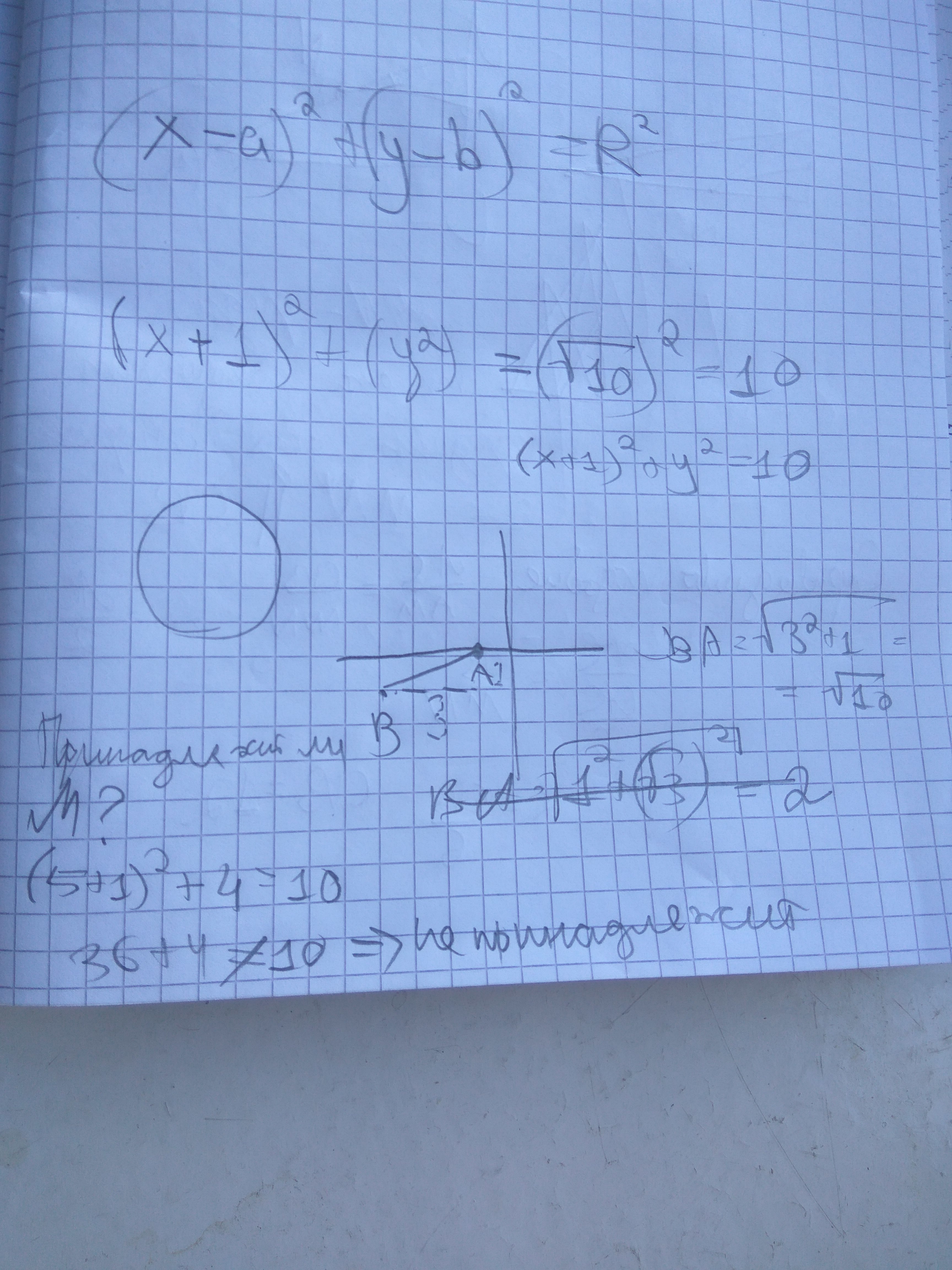 Даны точки A (-1;0),B (-4;-1). Запишите уравнение окружности с центром в точке A и радиусом AB . Принадлежит ли этой окружности точка M (5;-2)
