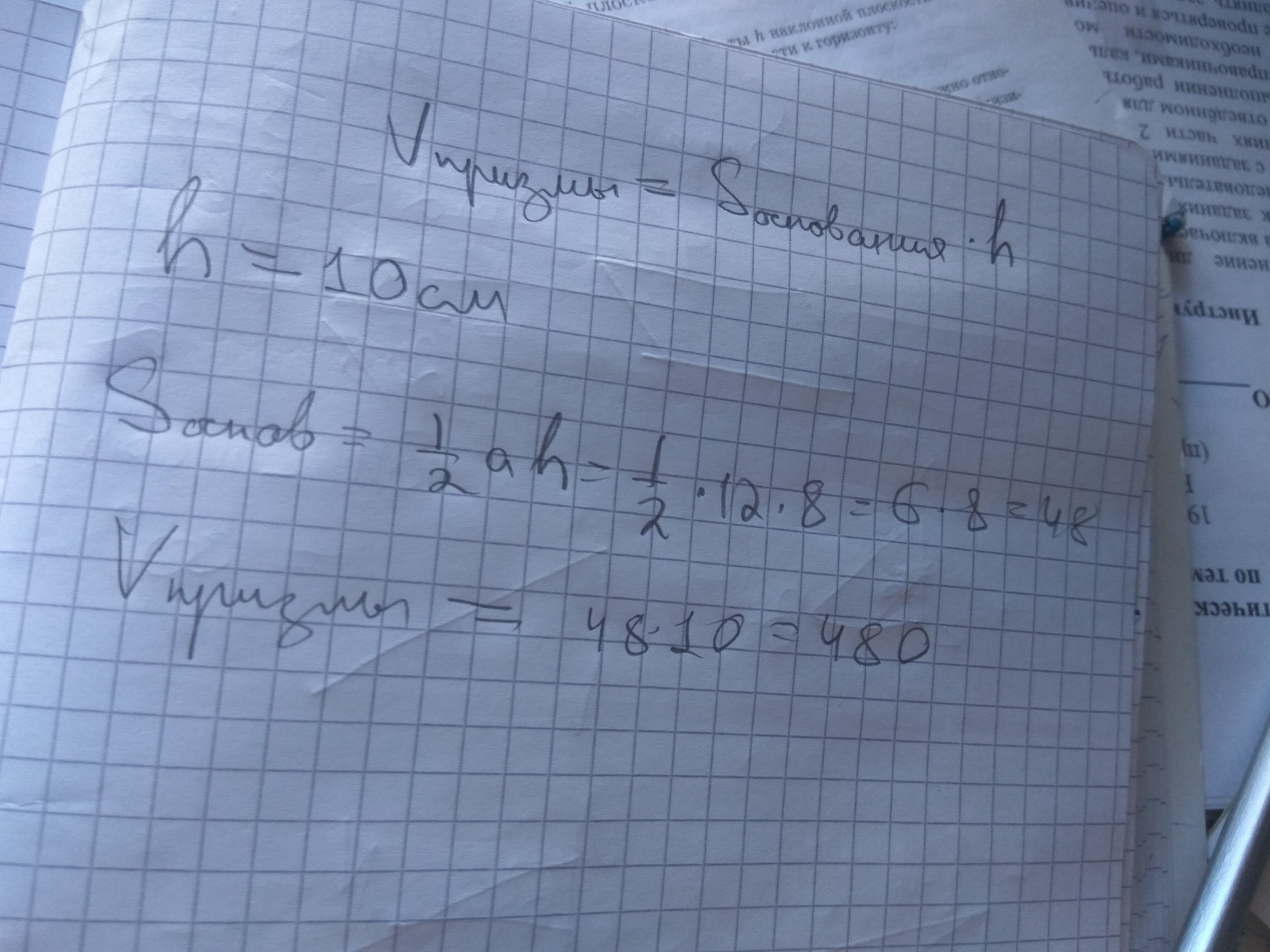 В основании прямой призмы лежит равнобедренный треугольник, основание которого равно 12см, а высота, проведённая к нему – 8см. Найти объём призмы, если высота призмы равна 10см