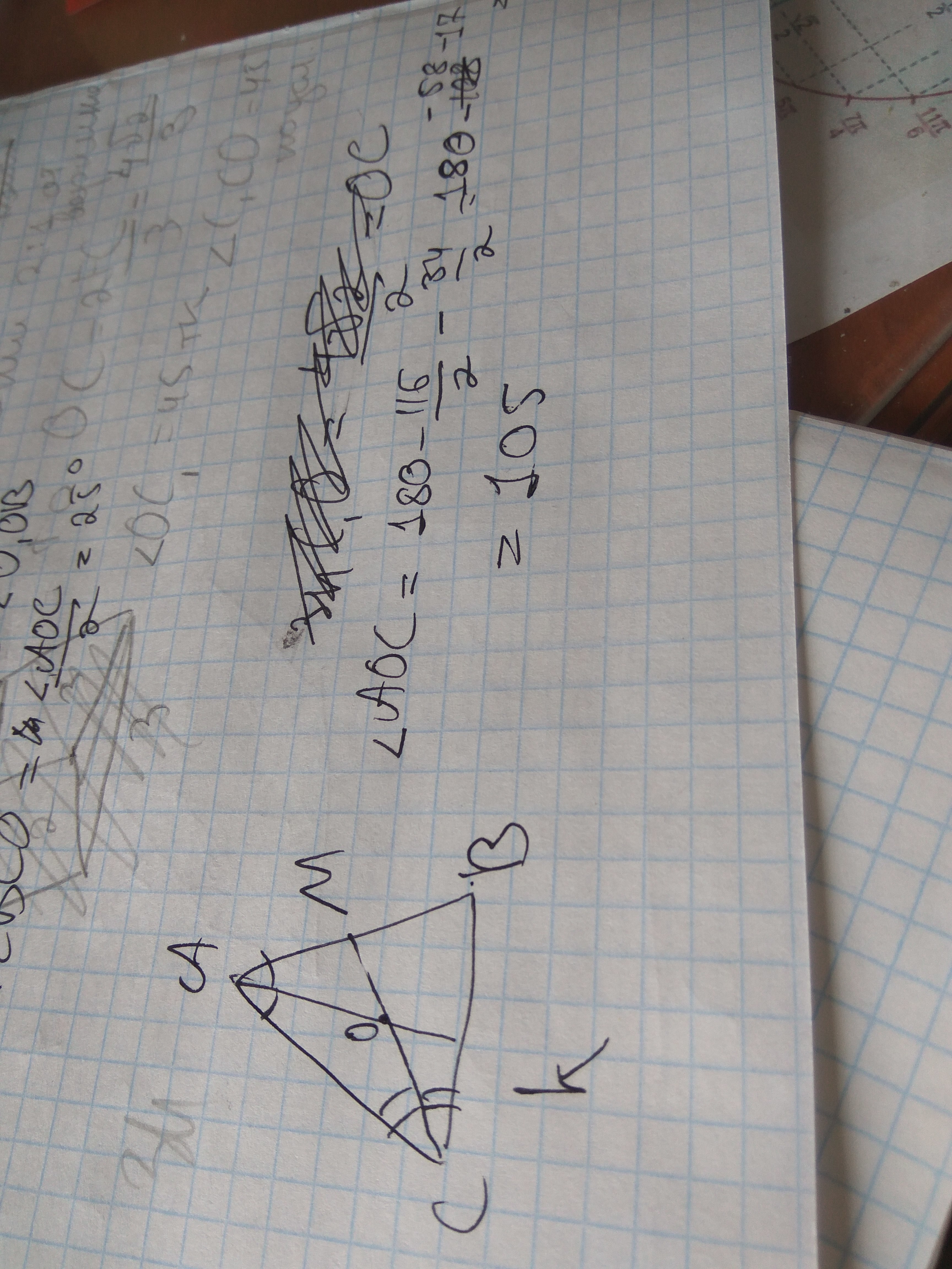 помогите пожалуйста решить, биссектриса ак и см треугольника авс пересекаются в точке о, угол вас=116 градусов, угол вса=34 градуса, найдите угол аос.