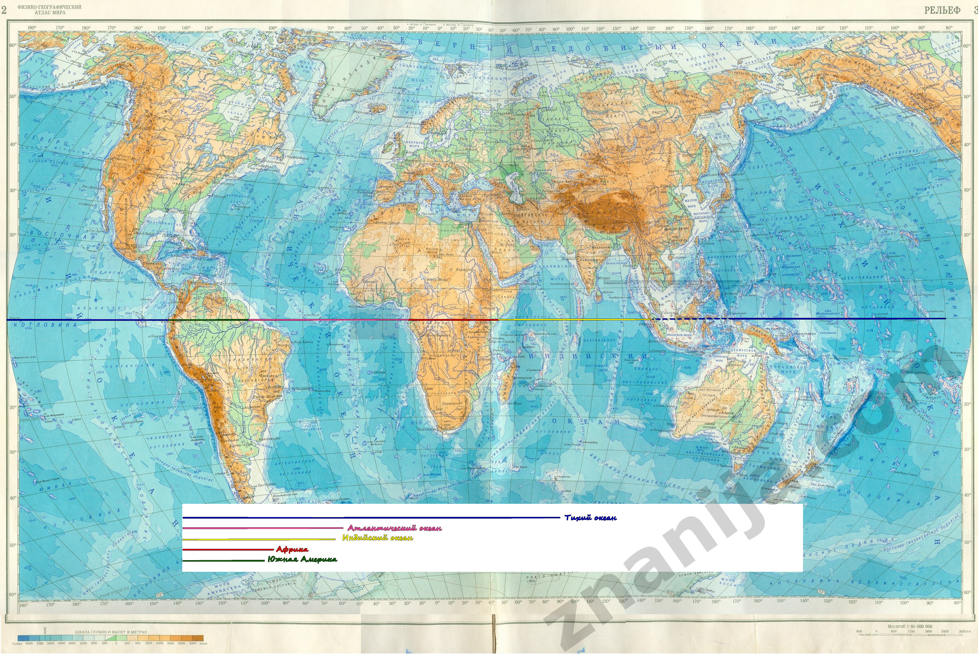 - На ней мы видим, что среди всех этих объектов наиболее широкую часть вдоль экватора имеет Тихий океан.