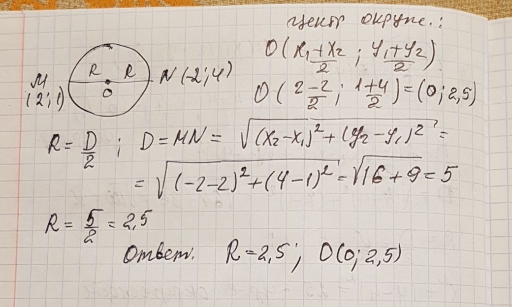 MN Диаметр окружности. Если М(2;1) и N(-2;4), то найдите радиус окружности и координаты центра окружности