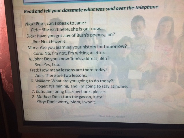 Нужно переделать в косвенную речь реплики. Например, первые две 1) Nick said if he could speak to Jean 2) Pete said that she was not there and she was out then.