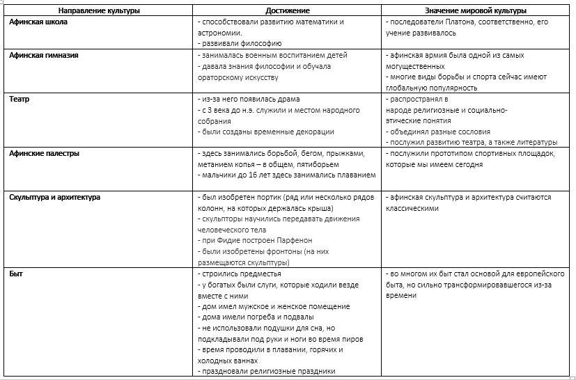 Заполните таблицу Направление культуры Достижение Значение мировой культуры 1 Афинская школа 2 Афинская гимназия 3 Театр 4 Афинские паллестры 5 Скульптура и архитектура 6 Быт