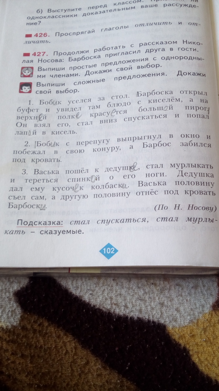 Барбоска открыл буфет и увидел там блюдо с кисилём, а на верхней полке красуется большой пирог. (Предложение сложное,потому что здесь 2 грамматические основы. 1-барбоска открыл и увидел. 2-пирог красуется.)