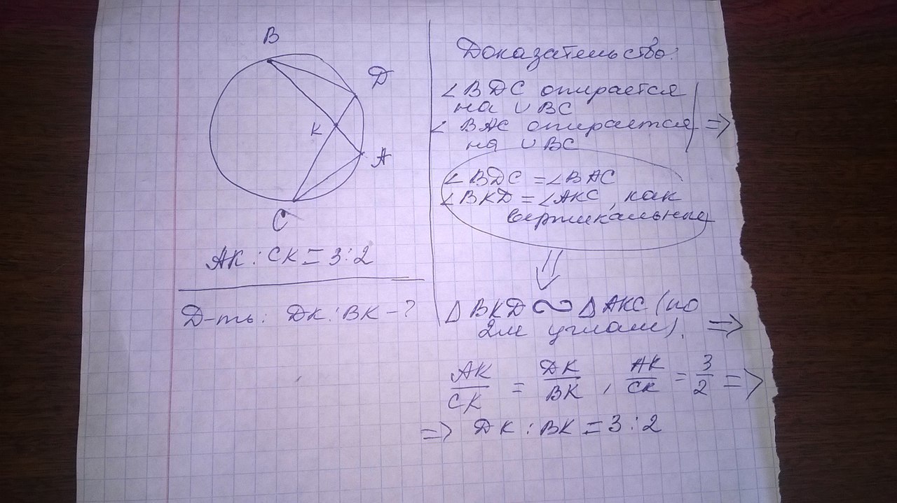 Хорды AB и CD пересекаются в точке K. Найдите DK : BK , если AK : CK=3:2. Обоснуйте ответ
