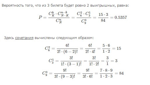 Среди 9 лотерейных билетов 6 выигрышных. Наудачу купили 3 билета. Вероятность того, что среди них 2 выигрышных равна
