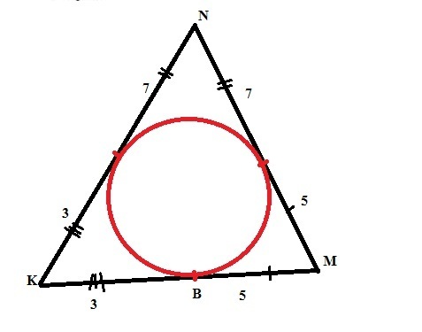 в треугольник КМN вписана окружность. Точка касания окружности со стороной КМ делит её на отрезки КВ=3 и ВМ=5 сторона МN равна 12. Найдите длину стороны КN.