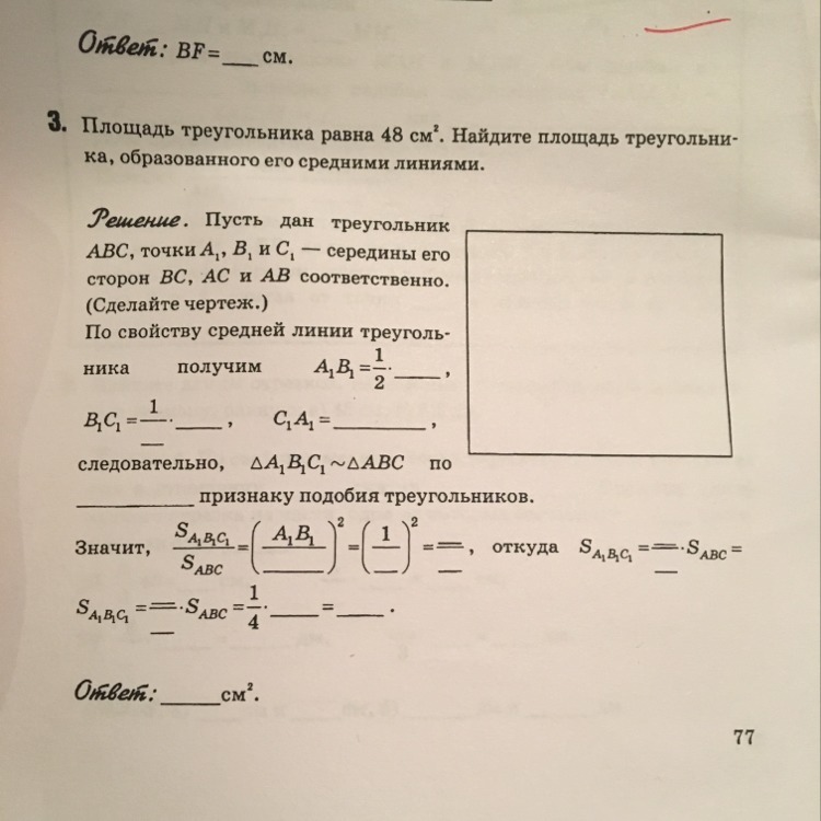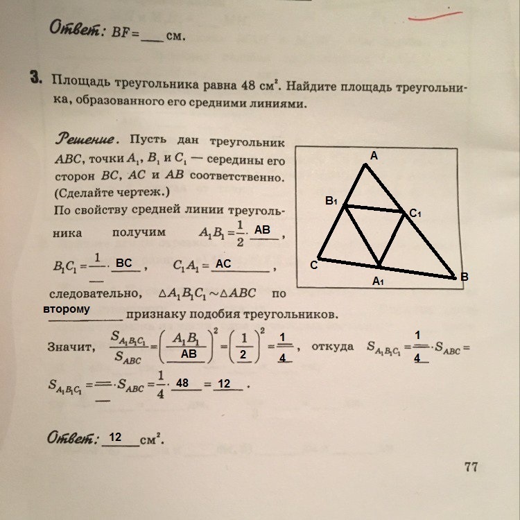 Площадь треугольника равна 48 см2. Найдите площадь треугольника, образованного его средними линиями.