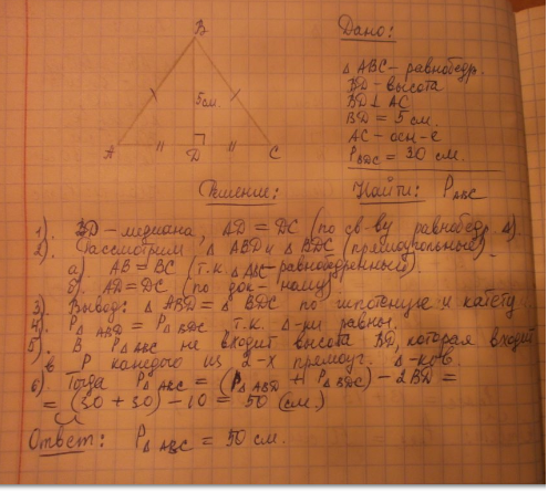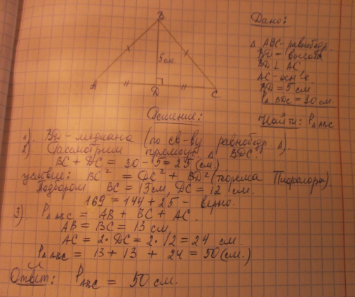 В равнобедренном треугольнике ABC, AС-основание, BD-высота этого треугольника,которая равна 5см. Периметр треугольника DBC равен 30см. Найдите периметр треугольника ABC.