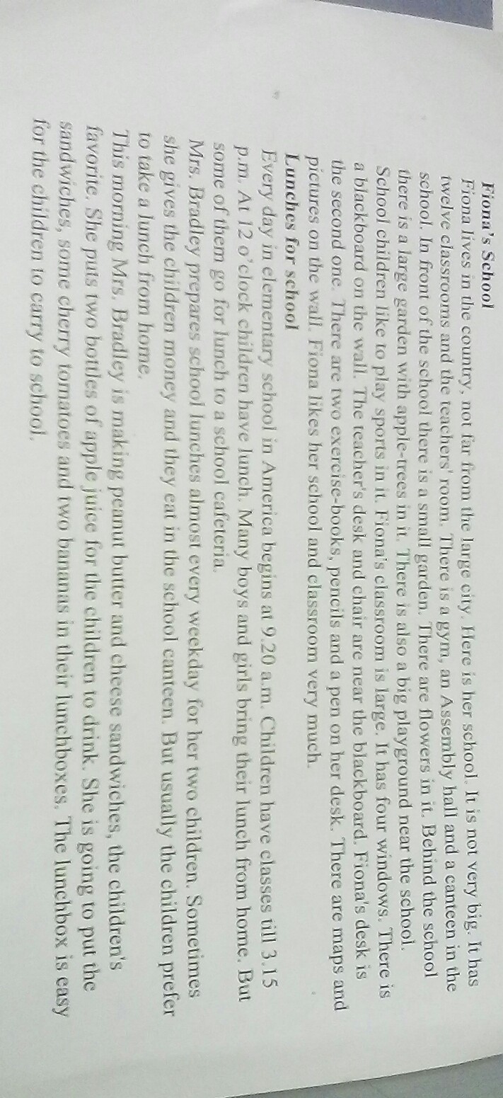 Школа Фионы Фиона живет в деревне, недалеко от большого города. Вот ее учеба. Она не очень большая. В нем есть классные комнаты и комната для учителей. В школе есть тренажерный зал, актовый зал и столовая. Перед зданием школы есть небольшой сад. В нем цветы. Позади школы находится большой сад с яблонями. В школе есть также большая игровая площадка. Детям школы нравится заниматься спортом. Классная комната Фионы большая, Она имеет четыре окна. На стене висит доске. Стол для учителей и стул расположены около черной доски, стол Фионы - второй. На ее столе две тетради, карандаши и ручка. Есть карты и картинки на стене. Фионе очень нравятся ее школа и класс. Обеды в школе Каждый день в начальной школе в Америке начинается в 9.20 м. У детей есть занятия до 3.15 вечера. В 12 часов дети обедают Многие мальчики и девочки приносят свой обед из дома. Буль некоторые из них идут на обед в школьную столовую. Миссис Брэдли готовит школьные обеды почти каждый будний день для своих двоих детей. Иногда она дает детям деньги, и они едят в школьной столовой. Но обычно дети предпочитают обедать из дома. Сегодня утром мистер Брэдли готовит сэндвичи с арахисовым маслом и сыром, любимые дети. Она кладет две бутылки яблочного сока, чтобы дети могли пить. Она собирается положить бутерброды, некоторые помидоры черри и два банана в коробках для завтрака. Детская лента легко переносится в школу