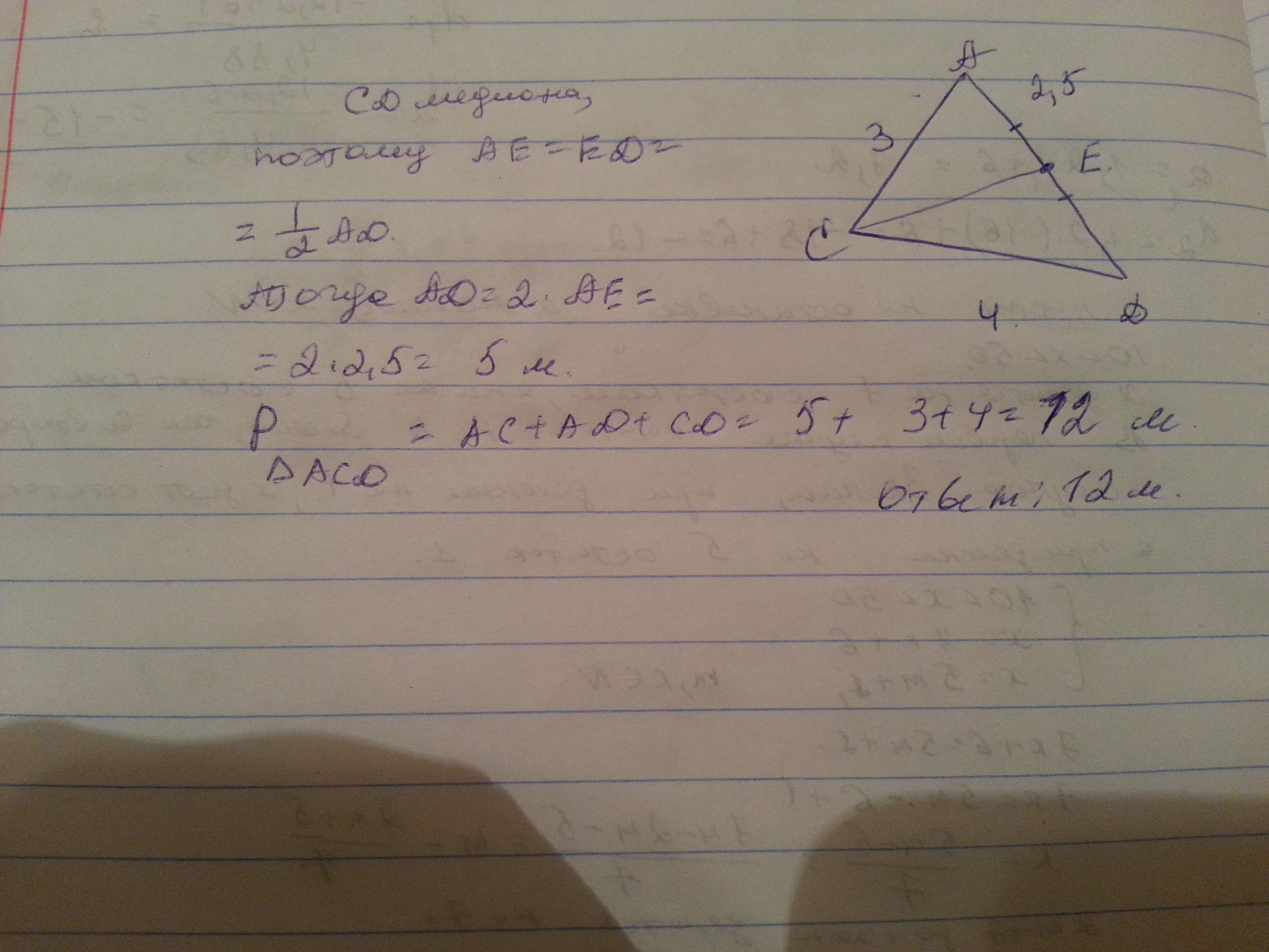 Отрезок СЕ является медийной АСД. Известно, что АЕ=2,5см, АС=3см, СД=4см. Найдите периметр треугольника АСД.