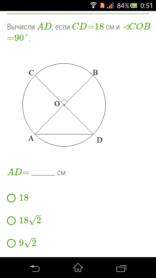 Вычисли AD, если CD=18 см и ∢COB=90°.