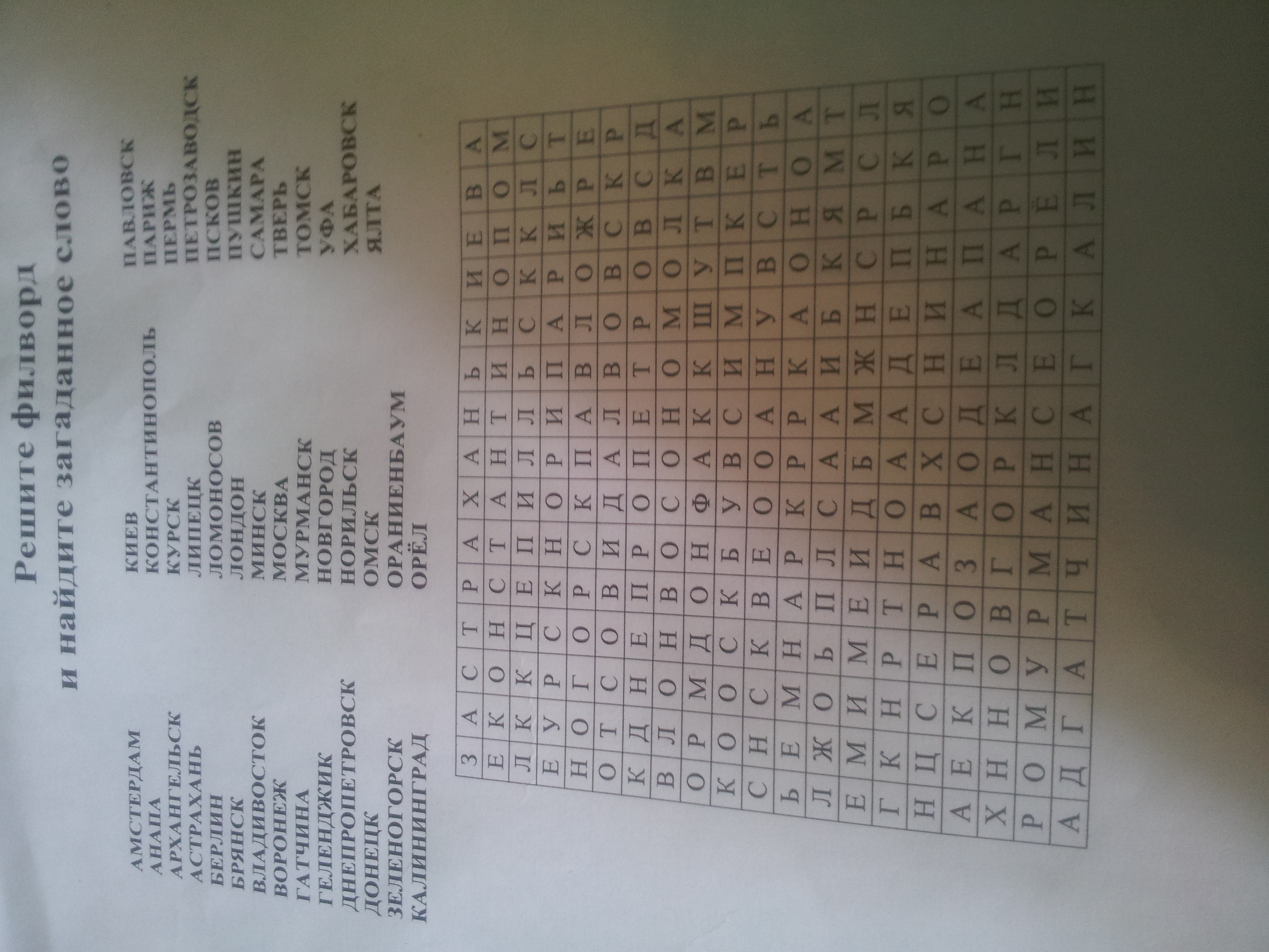 смотри, букву в строке КАЖДОЙ находи, на которую начинается город.И смотри вокруг, нету ли там следующей второй буквы города.