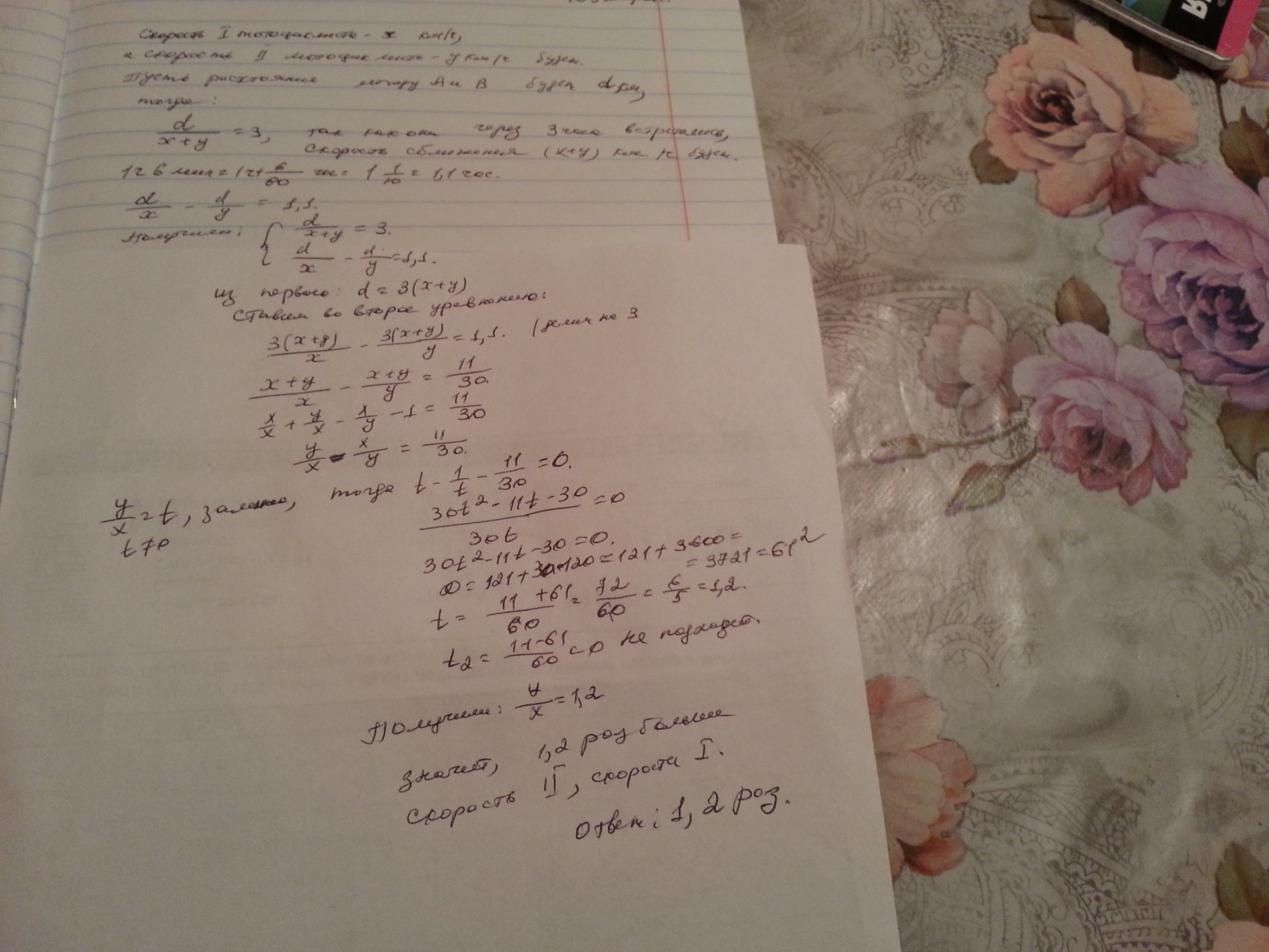 . Из А в В и из В в А выехали одновременно два мотоциклиста. Они встретились через 3 ч. Первый мотоциклист прибыл в В на 1 ч 6 мин позже, чем второй в А. Во сколько раз скорость второго мотоциклиста больше скорости первого? А. В 1,5 раза. Б. В 1,3 раза. В.