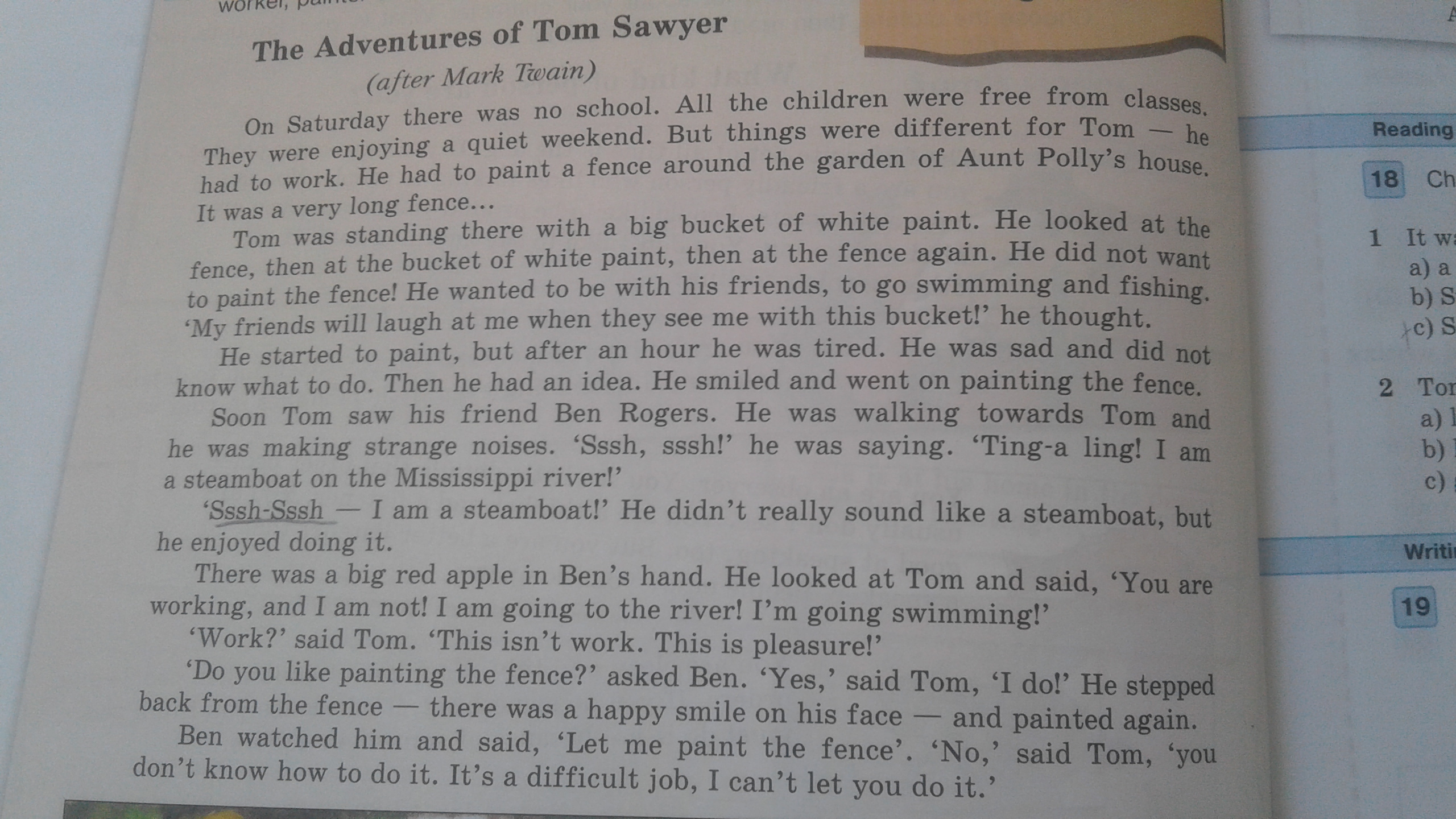 "Да, конечно"-ответил Том. Он встал спиной к забору-на его лице была счастливая улыбка-и снова начал красить.