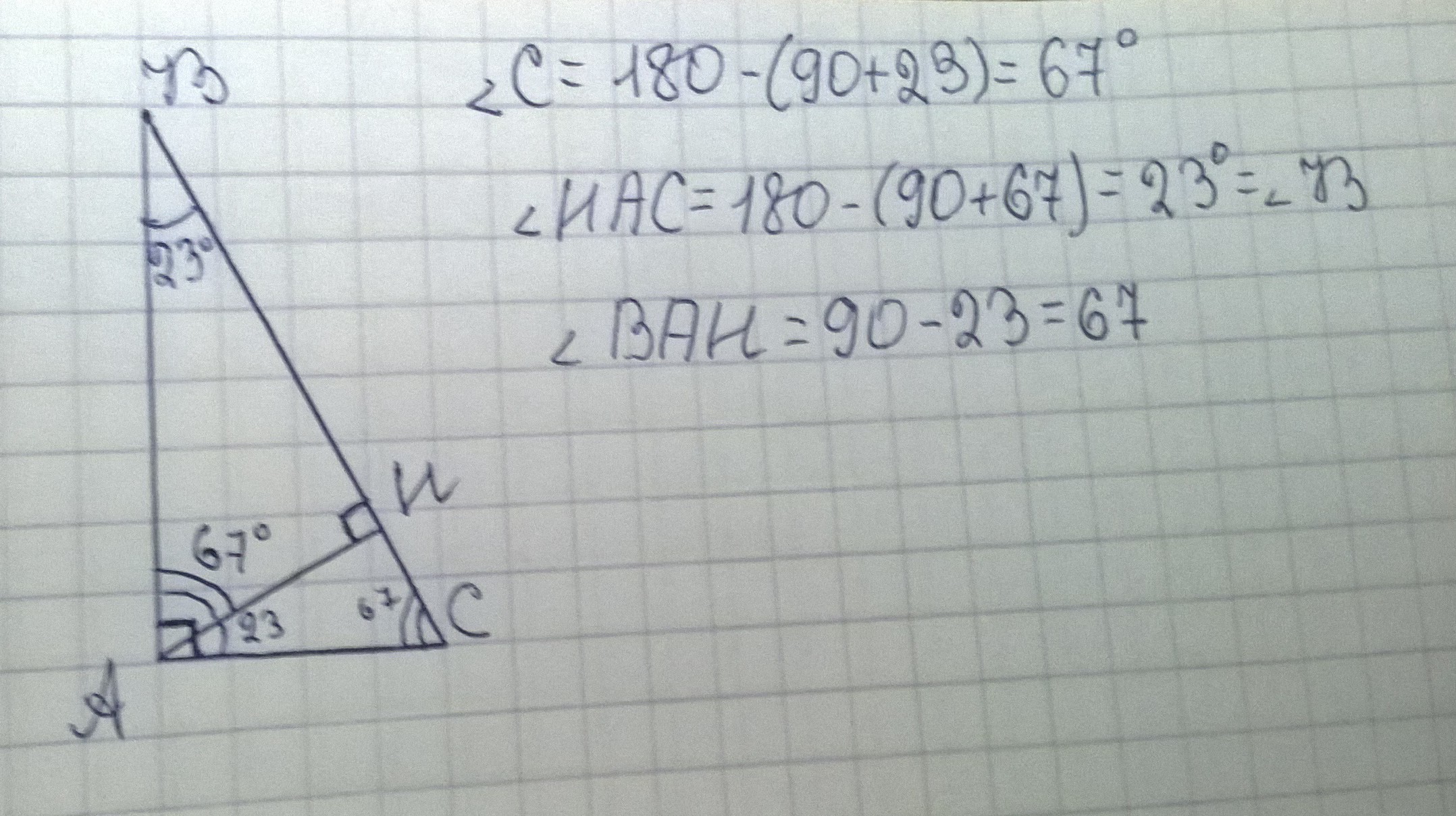 Острый угол прямоугольного треугольника равен 23*,найдите углы ,которые образует высота ,проведённая из вершины прямого угла ,с катетами (пожалуйста с рисунком )
