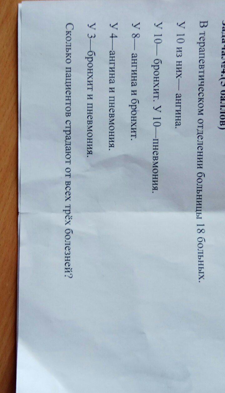 В терапевтическом отделении больницы 18 больных. У 10 из них - ангина.У 10-бронхит. У 10-пневмония. У 8-ангина и бронхит. У 4 -ангина и пневмония. У 3 - бронхит и пневмония. Сколько пациентов страдают от всех трех болезней?