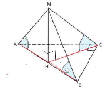 Каждое ребро пирамиды – наклонная, являющаяся гипотенузой прямоугольного треугольника. Один из катетов этих треугольников– проекция ребра на плоскость основания, второй катет общий у всех этих треугольников, и это высота МН самой пирамиды; по условию она противолежит углу 30°. Проекции этих наклонных – ребер пирамиды – равны медиане СН основания, т.е. половине гипотенузы треугольника АВС основания пирамиды,( свойство медианы прямоугольного треугольника).