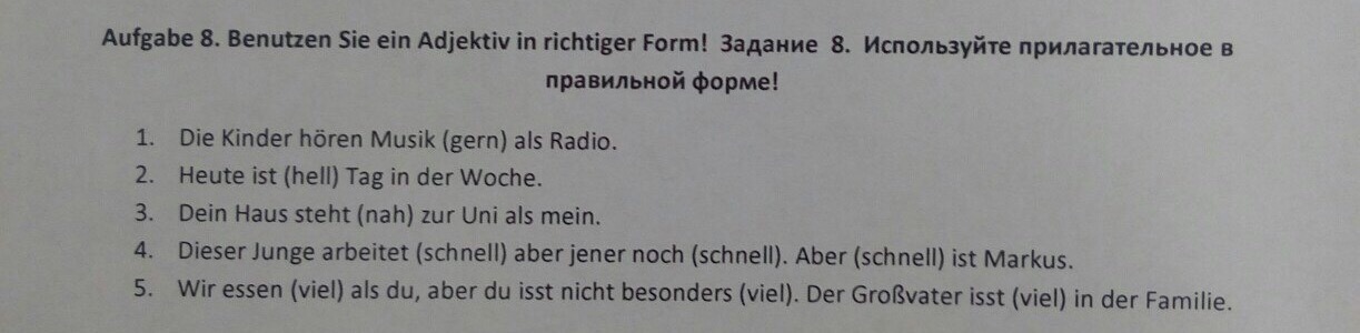 1. Die Kinder hören Musik (gern) als Radio. 2. Heute ist (hell) Tag in der Woche. 3. Dein Haus steht (nah) zur Uni als mein. 4. Dieser Junge arbeitet (schnell) aber jener noch (schnell). Aber (schnell) ist Markus. 5. Wir essen (viel) als du, aber du isst nicht besonders (viel). Der Großvater isst viel in der Familie.