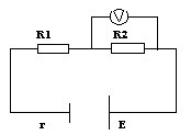 Сопротивление резистора R1 = 5 0м; R2 = 3 0м, внутренним сопротивление источника тока r = 2 0м, величина ЭДС источника тока Е = 10 В. Определите напряжение вольтметра.
