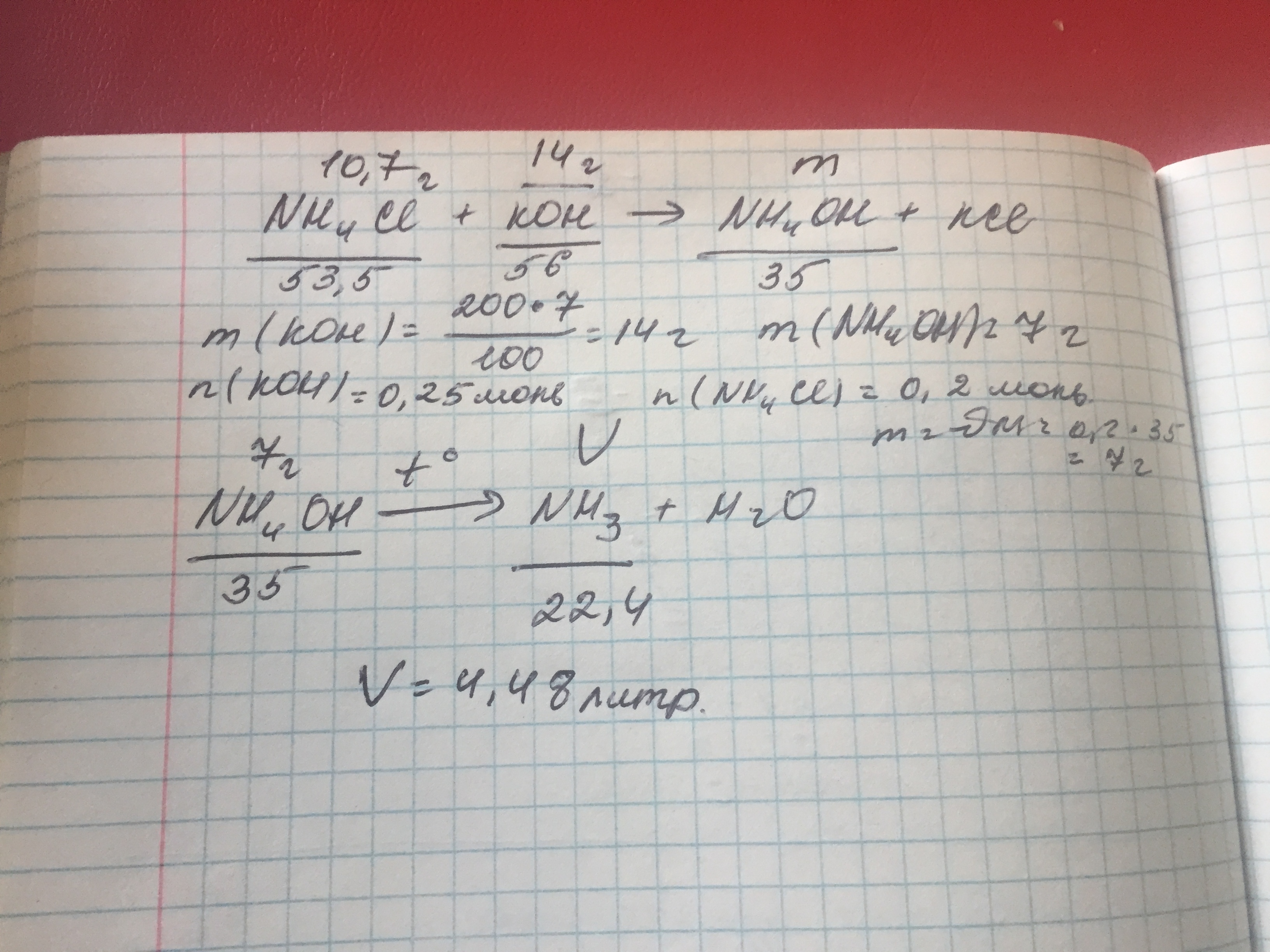 Сначала находишь массу NH4OH, для этого вычисляешь массу KOH, затем находишь n(KOH), n(NH4CI). После нагреваешь NH4OH, образуется NH3 и H2O. По найденной выше массе вычисляешь объём аммиака. Вот и все