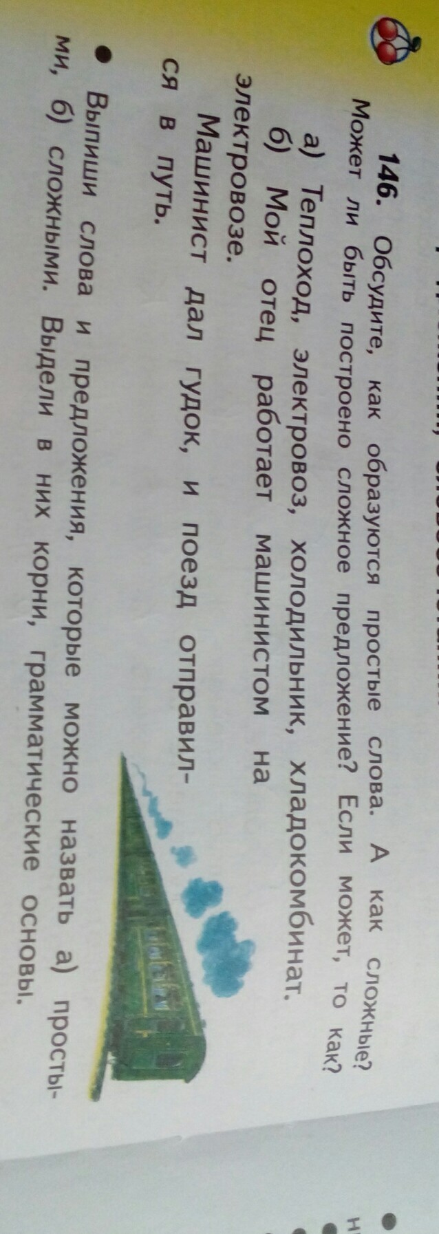 сложные:теплоход(корни тепл и ход),электровоз (корни электр и воз),машинист(подлежащее) дал(сказуемое) гудок,и поезд(подлежащее) отправился(сказуемое) в путь.