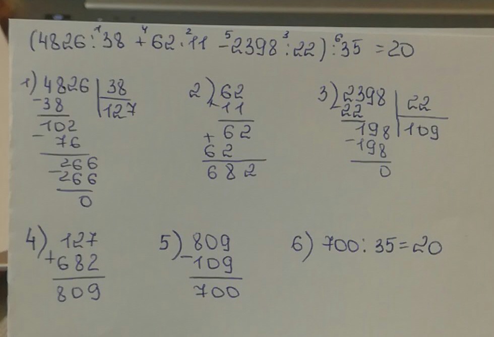 Пожалуйста решите мне пример ПО ДЕЙСТВИЯМ,НАПИШИТЕ ДЕЙСТВИЯ!!!ПРИМЕР- (4826:38+62×11-2398:22):35=...