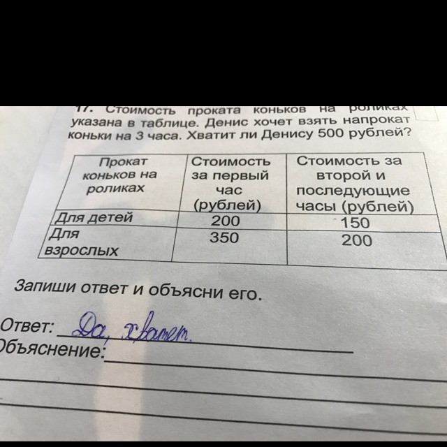 Стоимость проката коньков на роликах указана в таблице.Денис хочет взять напрокат коньки на 3 часа. Хватит ли Денису 500 рублей? Запиши ответ и объясни его.
