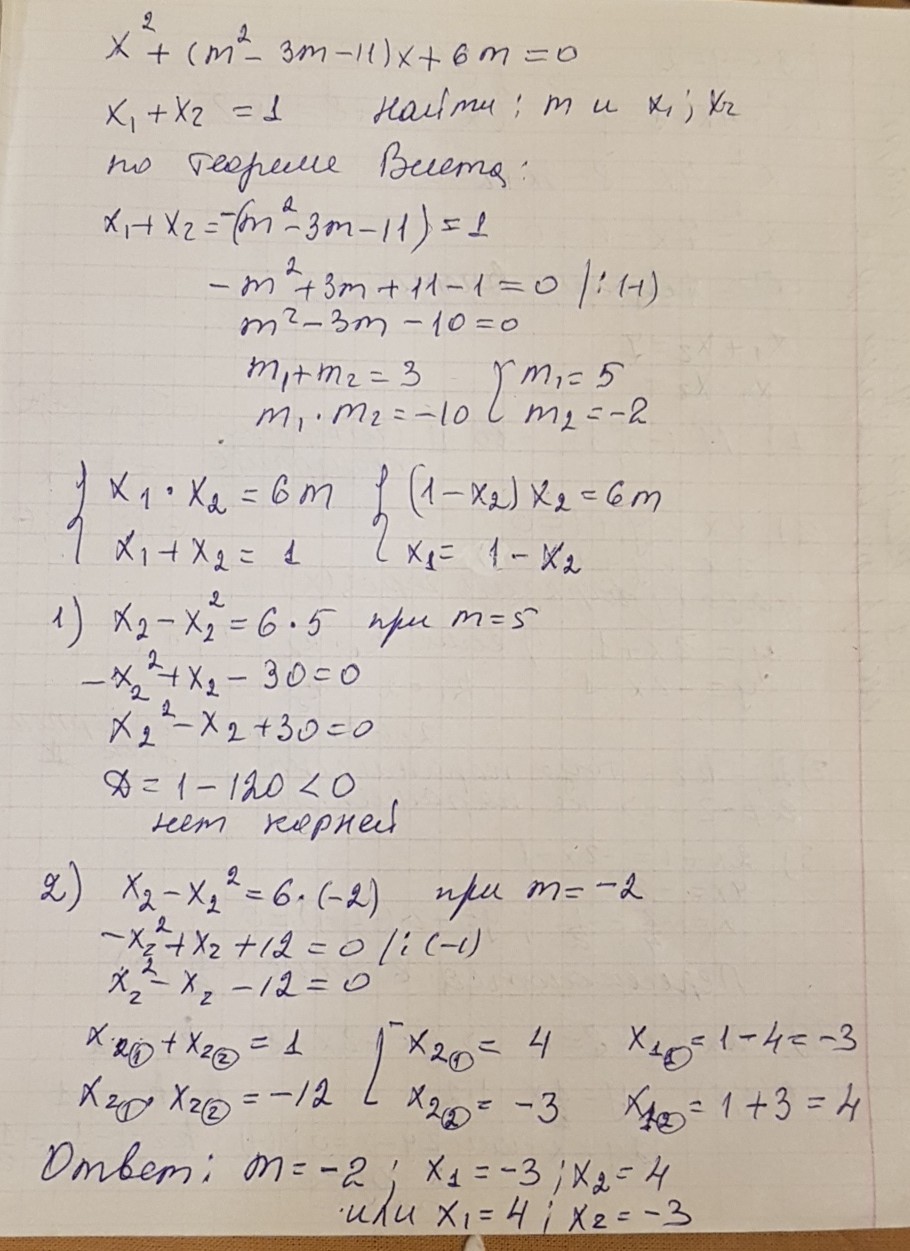 Помогите плииз!!!Уже третий раз пишу! Дано уравнение х2+(m2-3m-11)x+6m=0. Известно,что сумма его корней равна 1 .Найдите значение параметра m и корни уравнения.