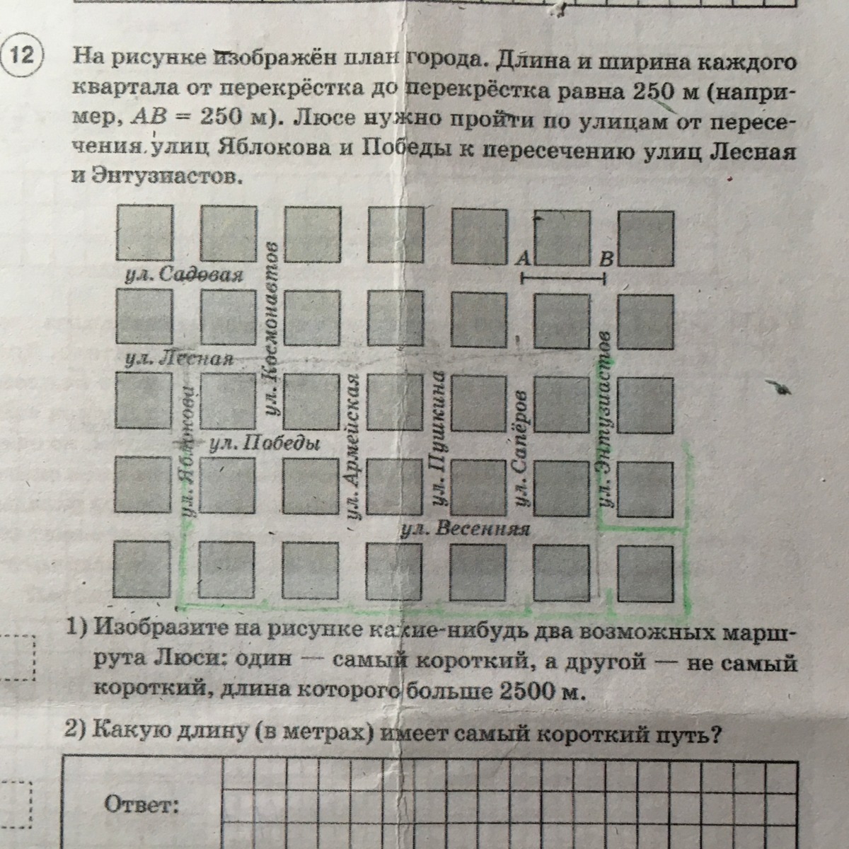 Самый короткий маршрут - вверх один квартал и вправо до пункта назначения. Для ответа на пункт Б нужно "петлять" вокруг квадратов - можно змейкой пройтись по нижним клеткам