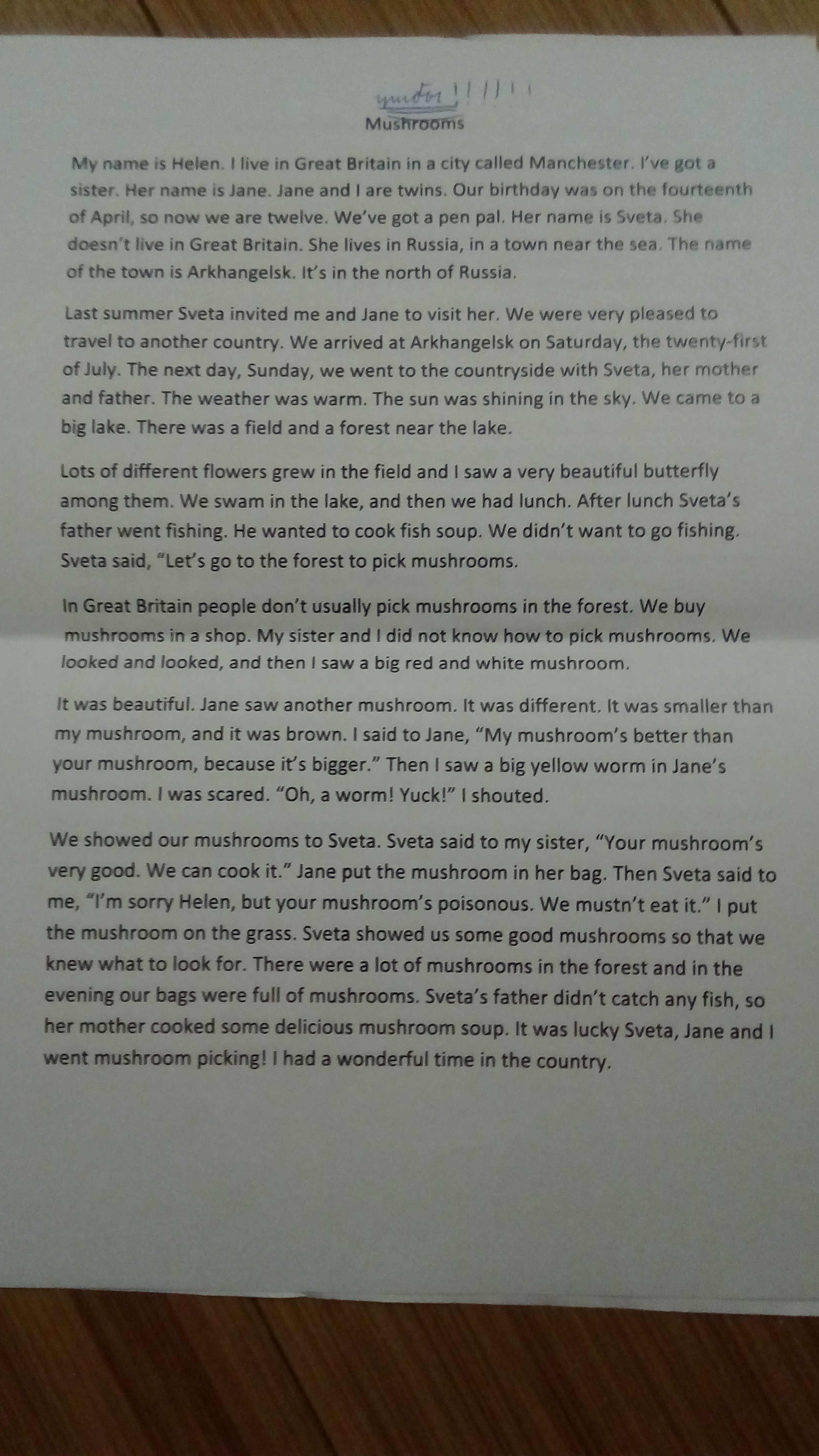 Меня зовут Хелен, я живу в Великобритании в городе Манчесте. У меня есть сестра. Ее зовут Джейн, Джейн и близнецы. Наш день рождения был в апреле, так что теперь нам двенадцать. У нас есть друг по переписке. Ее зовут Света С, которая живет не в Великобритании. Она живет в России, в городе недалеко от города. Архангельск. Это на севере России. Прошлым летом Света пригласила меня и Джейн навестить ее. Нам было очень приятно путешествовать в другую страну. Мы прибыли в Архангельск в субботу, двадцать первого июля. На следующий день, в воскресенье, мы отправились в деревню с 5veta, ее матерью и отцом. Погода была теплой. Солнце сияло в небе. Мы подошли к большому озеру. Рядом с озером было поле и лес. В поле росло множество разных цветов, и я увидел среди них очень красивую бабочку. Мы плавали в озере, а потом мы обедали. Отец Сеты отправился на рыбалку. Он хотел приготовить рыбный суп. Мы не хотели ловить рыбу. Света сказала: «Пойдем в лес собирать грибы ... В Великобритании люди обычно не собирают грибы в лесу Мы покупаем грибы в магазине, мы с сестрой не умели собирать грибы, смотрели и смотрели, А потом я увидел большой красный и белый гриб, он был красив, Джейн увидела еще один гриб, он был другой, он был меньше моего гриба, и он был коричневым. Я сказал Джейн: «Мой гриб лучше, чем твой гриб, потому что это Больше ». Затем увидел в желтом черном крупном желтом червяке, испугался:« Вперед, червяк! Я крикнула, мы показали наши грибы Светке. Света сказала моей сестре: «У тебя очень хороший гриб. Мы можем это приготовить. Джейн положила гриб в свою сумку, а затем Света сказала мне: «Мне жаль, Хелен, но твой гриб ядовит. Мы не должны есть его ». Я поставил гриб на стирание, и Света показала нам хорошие грибы, чтобы мы знали, что искать. В лесу было много грибов, а вечером наши сумки были полны грибами Отец Светы не ловил рыбу, и ее мама приготовила вкусный грибной суп. Это была счастливая светка, мы с Джейн пошли грибочками, замечательно провели время в деревне.