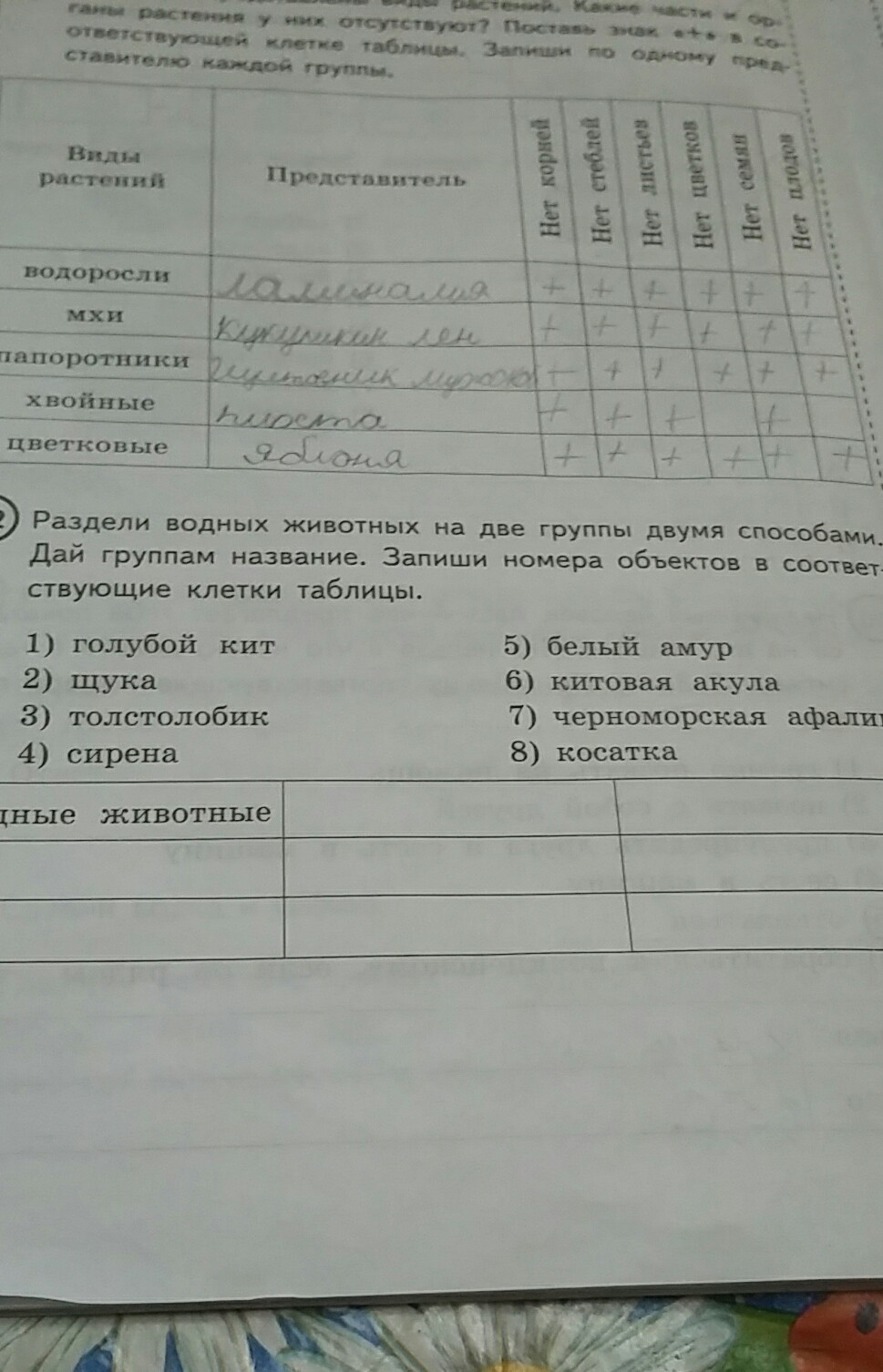 Раздели водных животных на две группы двумя способами дай группам названием запиши номера объектов в соответствующиеклетки таблицы.