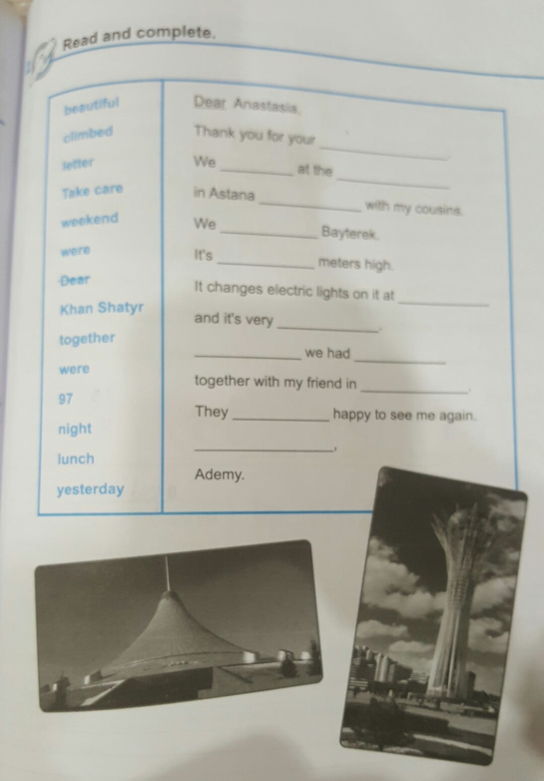 Thank you for your letter. We were at the weekend in Astsna with my cousins. We climbed Bayterek. Its 97 meters high. It changes electric lights on it at night and its very beautiful. Yesterday we had lunch togetger with my friend in Khan Shatyr. There were happy to see mr again.