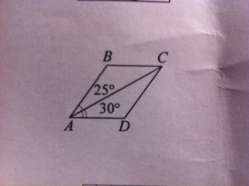 Диагональ AC параллелограмма ABCD образует с его сторонами углы,равные 25° и 30°. Найдите больший угол этого параллелограмма. Ответ дайте в градусах