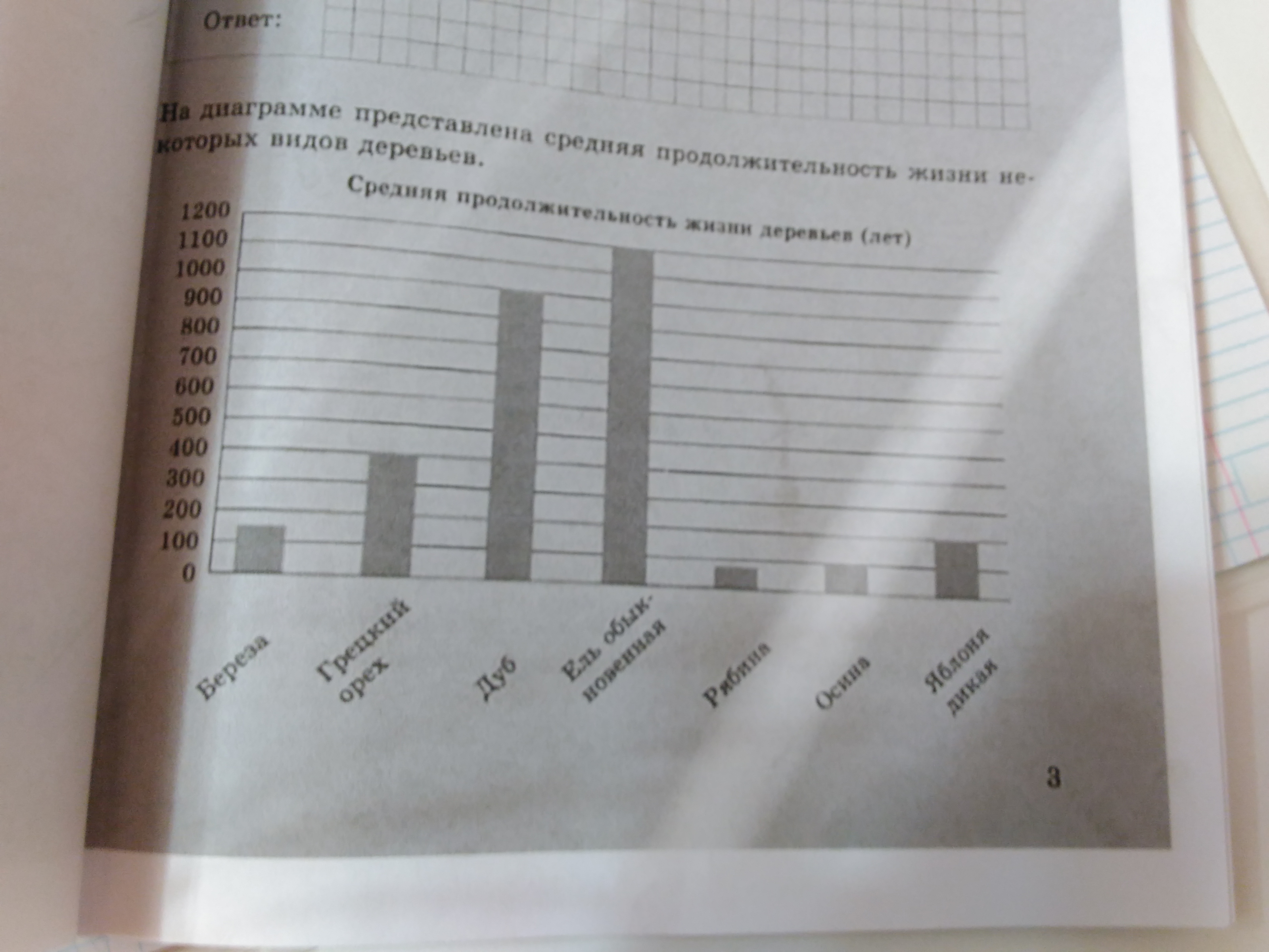 вопросы:какое из деревьев занимает второе место по продолжительности жизни среди представленных на диаграмме? Продолжительность жизни двух из представленных деревьев отличается в 3 раз.Какие это деревья?