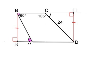 В ∆ СНD - угол НСD смежный углу 135° и равен 45°. Тогда угол СDН=45°. ⇒DH=CD•sin 45°=24•√2/2=12√2